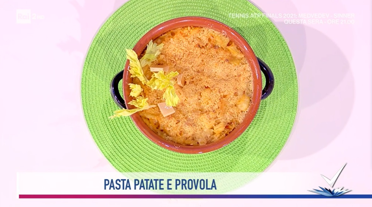 - 600 g patate, 350 g pasta mista, 150 g provola napoletana, 50 g pecorino, 50 g parmigiano grattugiato, 2 pomodorini Pachino, 2 crosta di parmigiano, 1 cucchiaio di concentrato di pomodoro, 1 carota, 1 costa di sedano, mezza cipolla, olio evo, sale e pepe