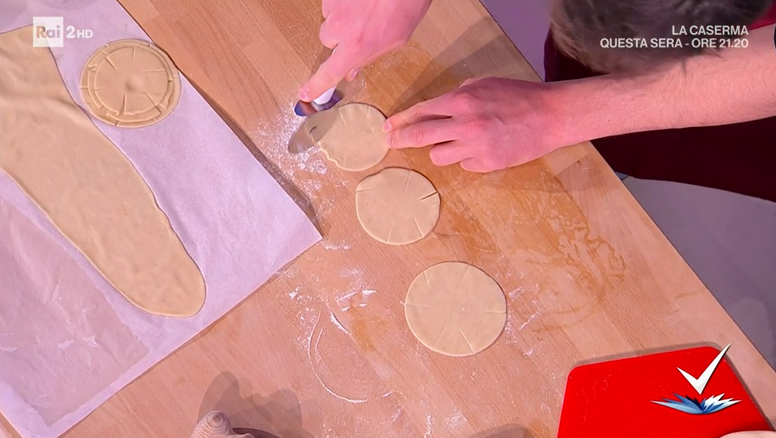 Tiriamo la sfoglia sottile con la macchinetta usata per la pasta fresca (la comune nonnapapera). Ottenute delle strisce sottilissime, ricaviamo dei dischetti con dei coppapasta di tre diversi diametri (usate anche delle tazze o dei bicchieri).