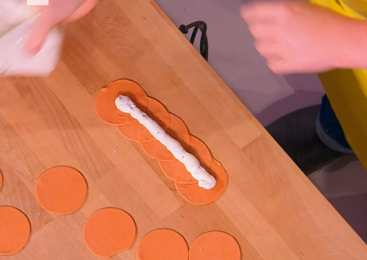 Ritagliamo dei dischetti dalla sfoglia e ne sovrapponiamo 5 (foto), schiacciando con le dita sulle congiunture. Sopra la striscia formata mettiamo il ripieno. Richiudiamo la sfoglia sul ripieno, a metà, ed assottigliamo con una bacchetta cinese o altro la parte delle congiuntura (i petali). Arrotoliamo su se stessi, in modo da formare la rosa. Cuociamo in acqua bollente e salata per 5 minuti.