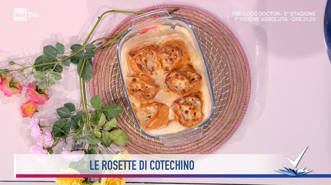 Sporchiamo la base di una pirofila con la besciamella ed adagiamo sopra le rosette, rivolgendo il taglio verso l’alto. Copriamo con la besciamella rimasta. Mettiamo in forno caldo e statico a 180° per 30 minuti.