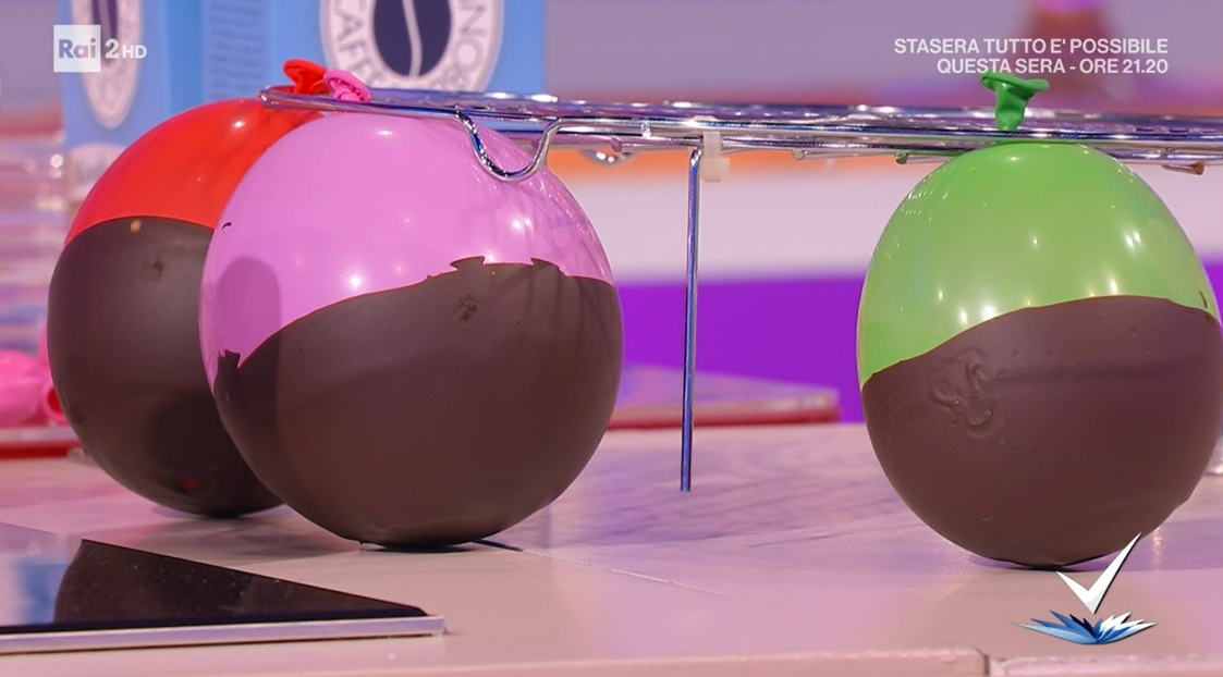 Sciogliamo il cioccolato fondente all’80% (max 45°). Lo portiamo a circa 37°, mescolando lontano dal fuoco. Immergiamo il palloncino (piccolo) gonfiato nel cioccolato per metà e lo appoggiamo sulla carta forno e lo mettiamo in freezer qualche minuto. In alternativa, usate uno stampo da silicone a mezzasfera. Scoppiamo il palloncino e sformiamo la mezzasfera.