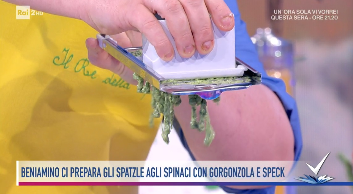 Portiamo a bollore (dolce) una pentola d’acqua con un filo d’olio. Posizioniamo sopra lo strumento per fare gli spatzle e coliamo all’interno l’impasto, facendo cadere gli spatzle direttamente nell’acqua bollente. Quando gli gnocchetti salgono a galla, li scoliamo e li tuffiamo nella salsa al gorgonzola. Serviamo con sopra lo speck dorato.