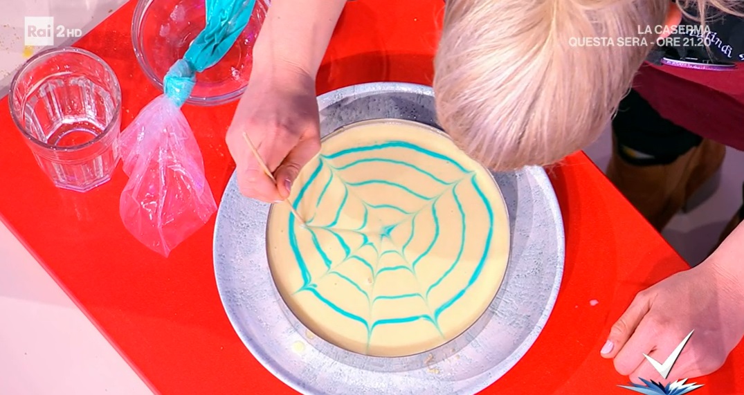 Versiamo la crema ancora calda sulla base di biscotti e la livelliamo. Con la crema blu ancora calda, disegniamo sulla crema bianca un puntino in centro e 4 cerchio, partendo dal centro, equamente distanziati. Con uno stuzzicadenti, quindi, disegniamo la ragnatela: dividiamo in spicchi, andando dapprima verso l’esterno, poi verso l’interno (foto o video sotto). Decoriamo a piacere e facciamo riposare qualche ora in frigorifero.