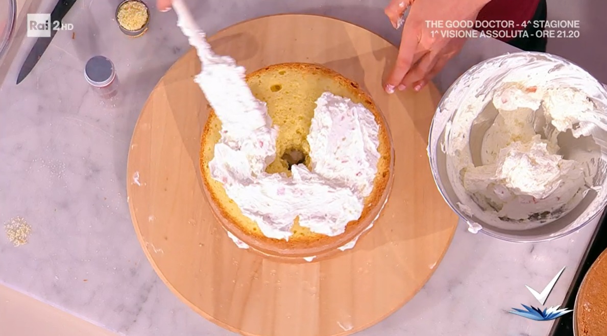 Prendiamo il primo strato di pan di Spagna, lo bagniamo con acqua zuccherata e, se vogliamo, pratichiamo un foro al centro della larghezza del regalo che andremo ad inserire. Spalmiamo sopra la panna con le fragole e sovrapponiamo un altro strato di pan di Spagna, che bagniamo. Proseguiamo fino a sovrapporre i pan di Spagna preparati. Spalmiamo sui lati la crema al burro e la lisciamo. Creiamo la coccarda di pasta di zucchero per decorare la torta. Ricordate di inserire il regalo al centro della torta prima di glassarla.