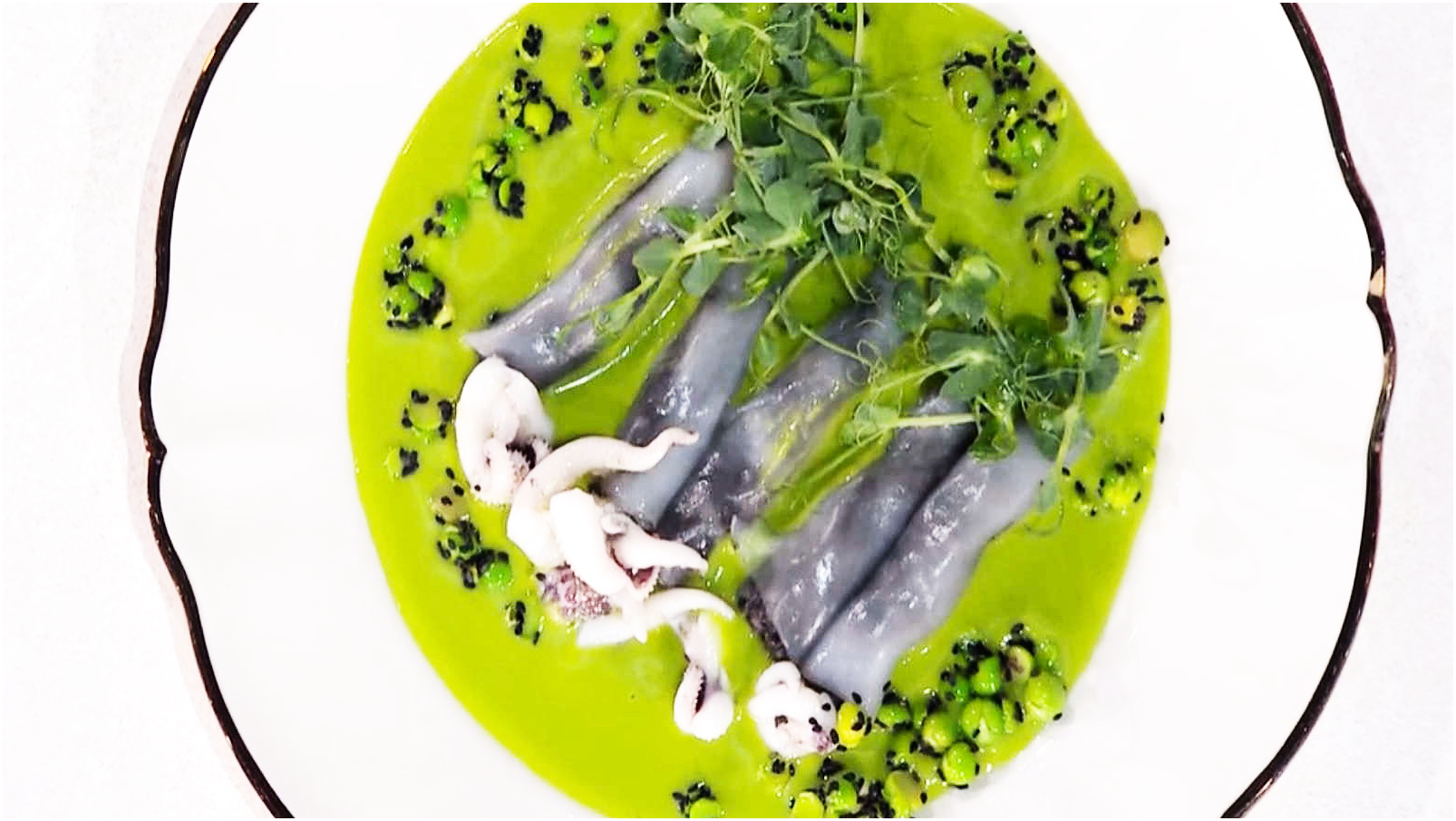 Per dare una forma originale al piatto, ricava dei petali dal corpo della seppia cruda e farciscili con un po’ del ragù preparato. Arrotola ogni petalo come se fosse un piccolo cannellone e, se desideri, scotta questi “cannelloni” in padella per conferire croccantezza. Servili su un letto di crema di piselli, accompagnati dai tentacoli conditi e da piselli spolverati con semi di sesamo nero.