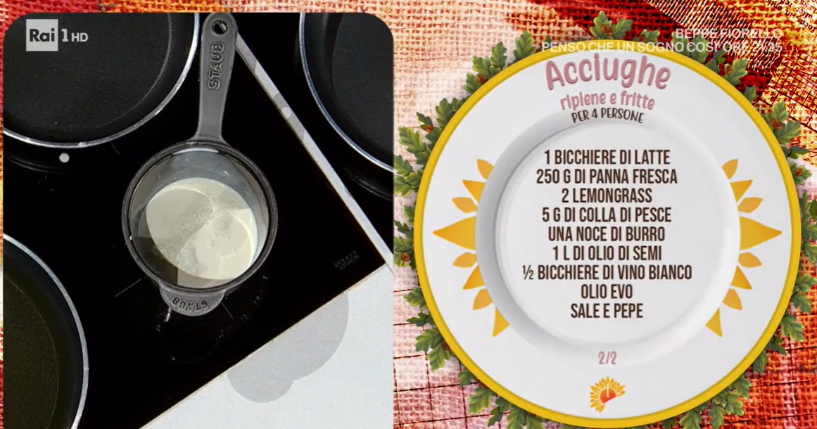 - 30 acciughe pulite, 2 acciughe dissalate, 1 patate bollite, 1 mazzetto di maggiorana, 4 uova, 50 g formaggio grattugiato, 50 g farina, 1 spicchio d’aglio, 1 fetta pane bianco, 1 bicchiere di latte, 250 g panna fresca, 2 lemongrass, 5 g colla di pesce, una noce di burro, 1 l olio di semi, mezzo bicchiere di vino bianco, olio evo, sale e pepe