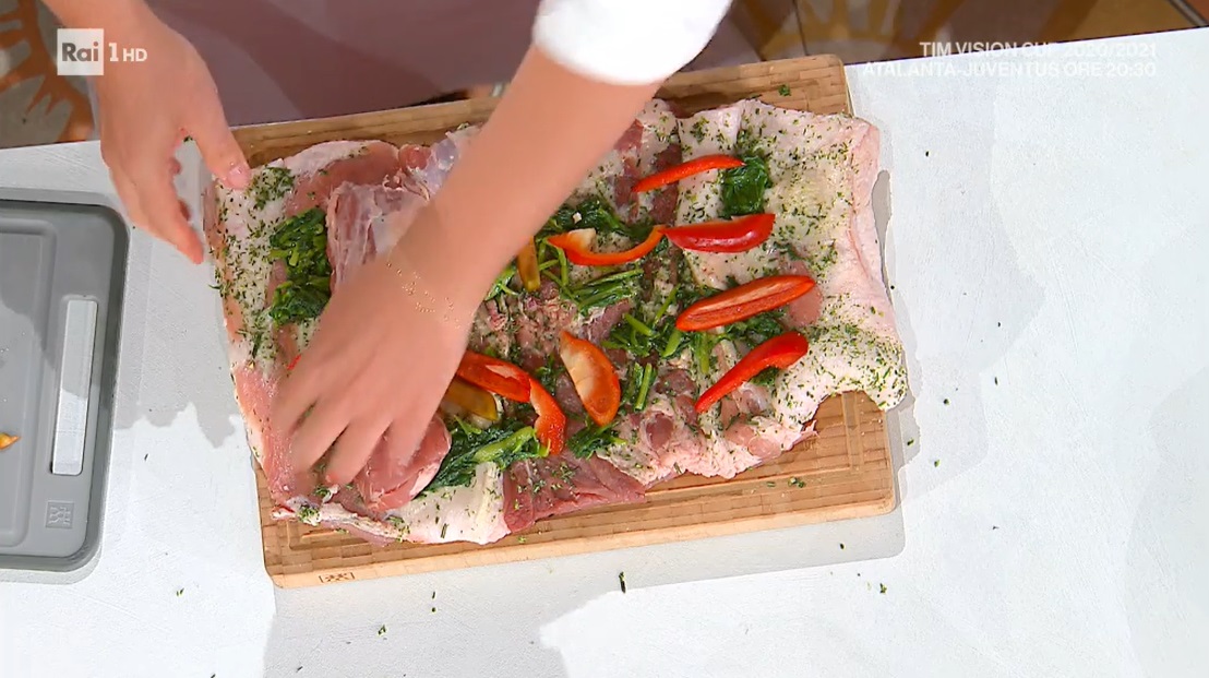 Sul piano, stendiamo la pancetta tesa in un unico pezzo. Distribuiamo sopra il sale aromatico preparato e massaggiamo. Spargiamo sopra le bietola ripassate ed il peperone pulito e tagliato a listarelle fini, ma ancora crudo. Posizioniamo il filetto su un lato della pancetta, quindi arrotoliamo quest’ultima sul filetto, in modo da ottenere un salsicciotto, che leghiamo con lo spago, come un classico arrosto.