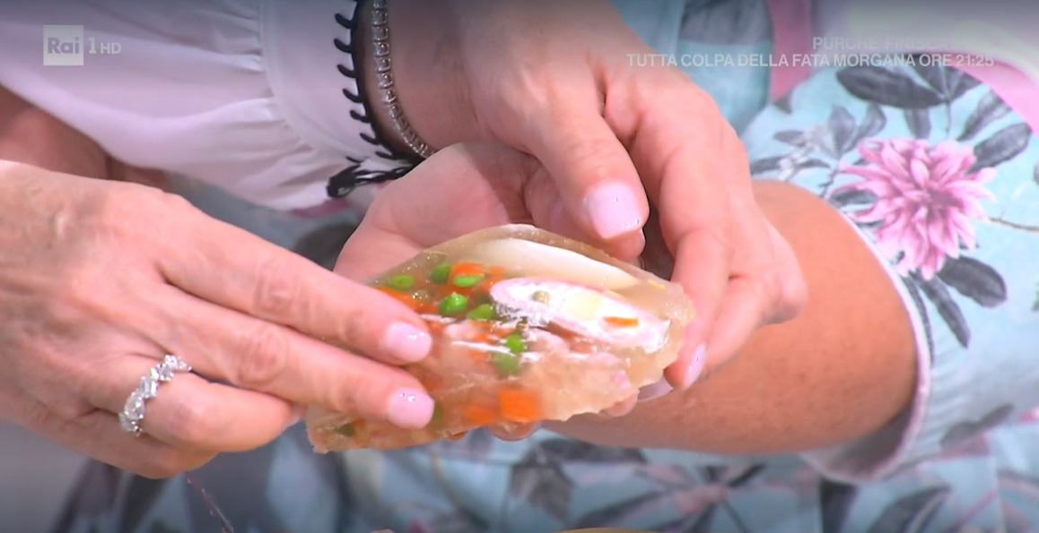 aspic anni 70 di zia CriInsieme a Lorenzo, Zia Cri oggi racconta gli anni ’70, epoca tanto cara a gran parte del cast del programma, preparando un piatto simbolo di quel decennio, l’aspic, ovvero una gelatina di pollo farcita con ogni ben di Dio.