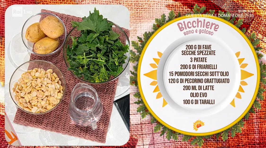 Componiamo i bicchieri: alla base mettiamo la purea di fave; formiamo sopra uno strato di crema ai friarielli. Copriamo con altro purè di fave e finiamo con qualche friariello saltato, pomodori secchi a pezzettini e taralli sbriciolati.