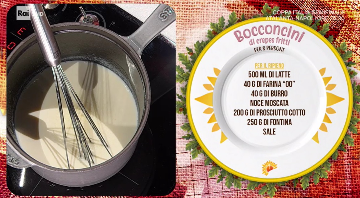 Prepariamo la besciamella: in un pentolino, facciamo sciogliere il burro ed uniamo la farina. Lasciamo dorare leggermente, quindi aggiungiamo il latte e, mescolando, portiamo a bollore. Finiamo con sale e noce moscata. Lasciamo raffreddare completamente, quindi uniamo il prosciutto cotto e la fontina a cubetti.