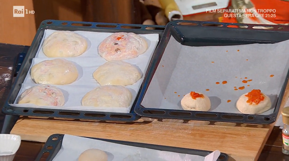 Ricaviamo delle palline da 60 g dall’impasto lievitato. Le lisciamo roteandole sul piano e le disponiamo su una teglia. Copriamo con la pellicola e lasciamo lievitare 2 ore a temperatura ambiente.