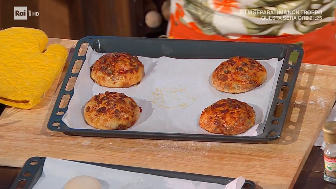 Allarghiamo ogni pagnottina sul piano infarinato, con le mani, fino ad ottenere un disco sottile anche sui bordi. Al centro, mettiamo dei pomodori pelati a pezzetti (scolati dal loro liquido), cipolla affettata finemente, acciughe, capperi, olive denocciolate ed una foglia di basilico. Richiudiamo l’impasto sul ripieno, sigillando bene la chiusura. Disponiamo i bomboloni sulla teglia, copriamo e lasciamo lievitare ancora 1 ora. Decoriamo in superficie con poco pomodoro e capperi e mettiamo in forno caldo e statico a 250° per 15 minuti.