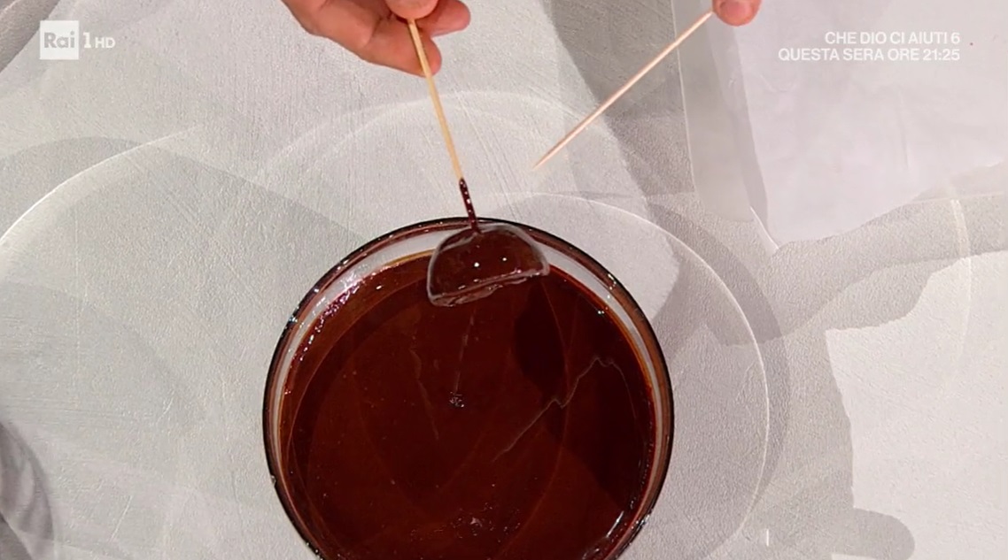 Prepariamo la copertura: in un pentolino, sciogliamo a fuoco bassissimo il cioccolato fondente tritato con l’olio vegetale (circa il 10% del peso del cioccolato). Lasciamo intiepidire.
