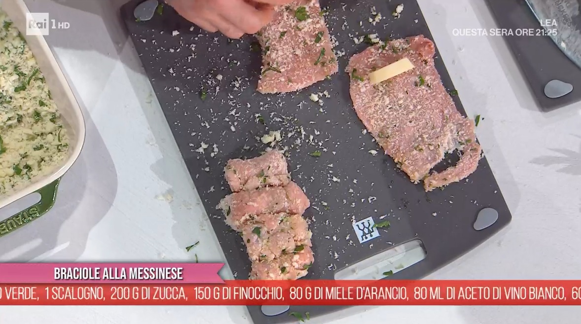 - 400 g fesa di vitello, 150 g mollica di pane, 80 g pecorino grattugiato, 150 g caciocavallo, prezzemolo, 1 spicchio d’aglio, olio evo, sale e pepe