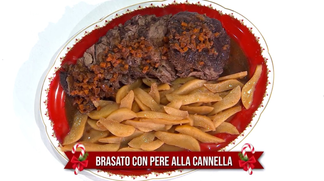 Serviamo il brasato a fette, con sopra il fondo di cottura e a fianco le pere.