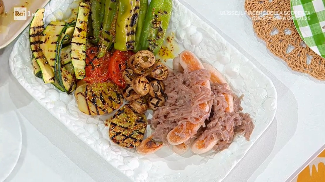 Tagliamo le patate già lessate a fette spesse, quindi le mettiamo a grigliare su una piastra ben calda. Grigliamo anche le zucchine, i peperoni friggitelli, i funghi tagliati a metà ed i pomodori ramati a fette o a metà. Una volta grigliate le verdure, le condiamo con un’emulsione di olio evo, senape in grani ed aceto ed una spolverata di sale.