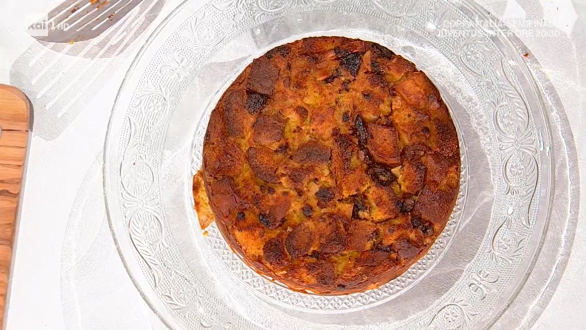 In un’altra ciotola, con le fruste elettriche, montiamo le uova intere insieme allo zucchero, quindi aggiungiamo anche la panna e mescoliamo pochi istanti. Aggiungiamo la miscela ottenuta al composto di pane e mescoliamo. Antonella consiglia di aspettare ancora un po’ di tempo, in modo che il pane assorba le uova. Trasferiamo il composto all’interno di una tortiera foderata con la carta forno. Cuociamo in forno caldo e statico a 170° per 40 minuti.