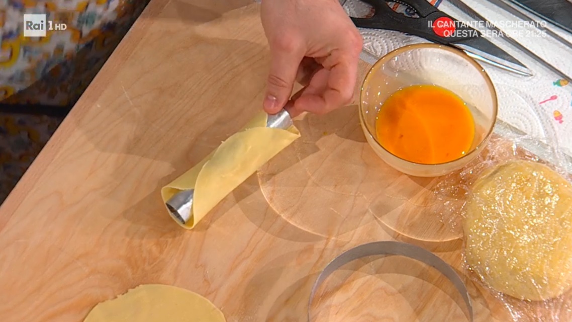 Tiriamo la sfoglia sottilissima, come fosse pasta all’uovo, quindi ritagliamo dei dischi con un coppapasta di circa 14 cm. Allunghiamo leggermente il disco ottenuto, in modo da renderlo leggermente ovale. Adagiamo la canna sul disco, la spennelliamo con poco uovo al centro, quindi pieghiamo sopra i due lembi della pasta, senza stringere troppo. Pressiamo bene sulla chiusura, in modo da sigillarla anche con l’aiuto dell’uovo.