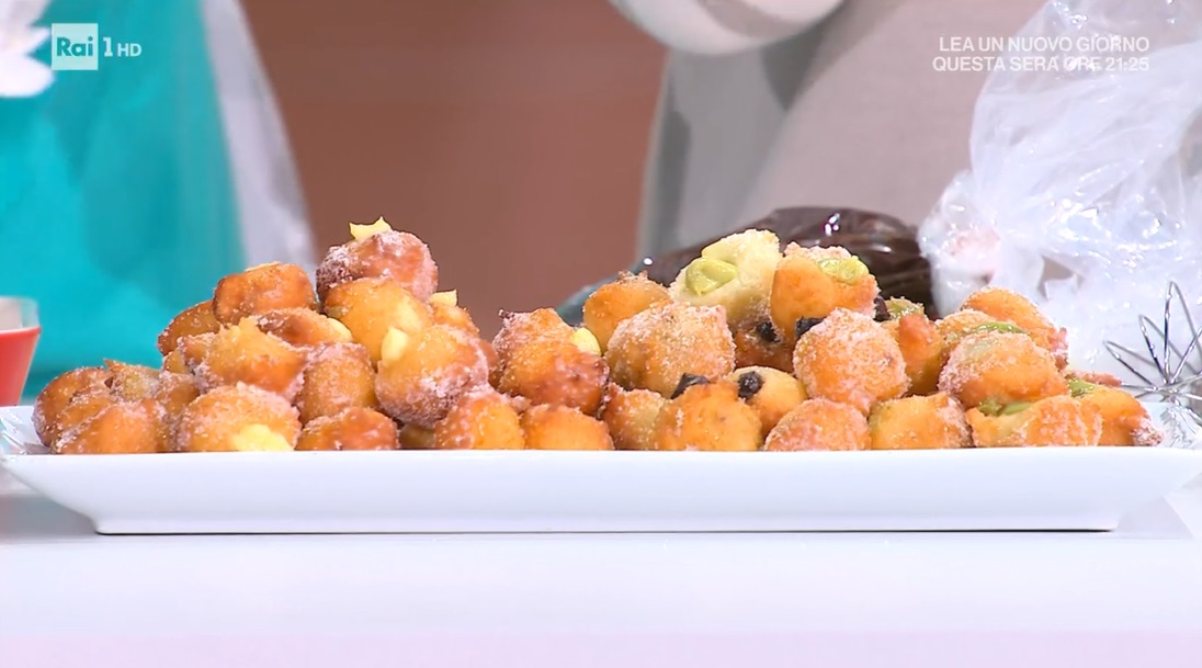 - Creme: 2 tuorli, 1 uovo, 120 g zucchero, 50 g amido di mais, 500 ml latte, 1 cucchiaino di estratto di vaniglia, 10 g cacao amaro, 10 g pasta pura di pistacchio, olio per friggere