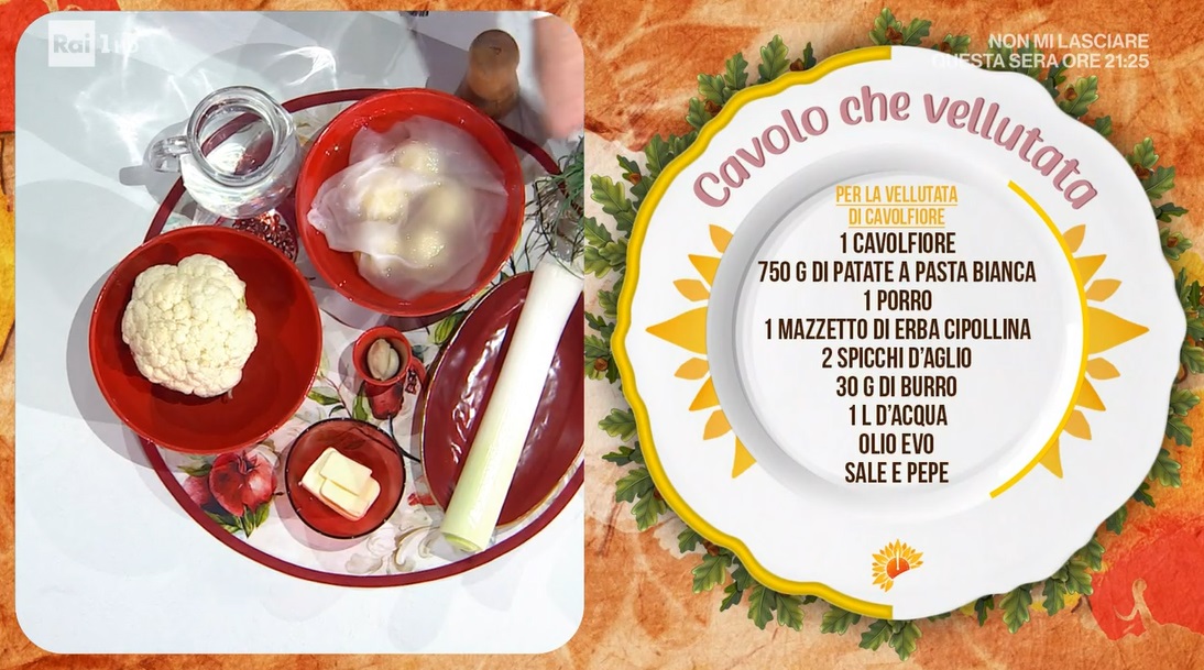 - 1 cavolfiore, 750 g patate a pasta bianca, 1 porro, erba cipollina, 2 spicchi d’aglio, 30 g burro, 1 l acqua, olio evo, sale e pepe