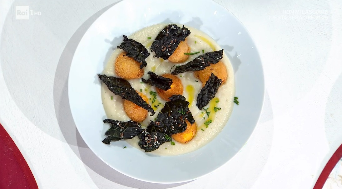 Serviamo la crema di cavolfiore con sopra le chips di cavolo nero, i tuorli fritti e l’erba cipollina tritata.