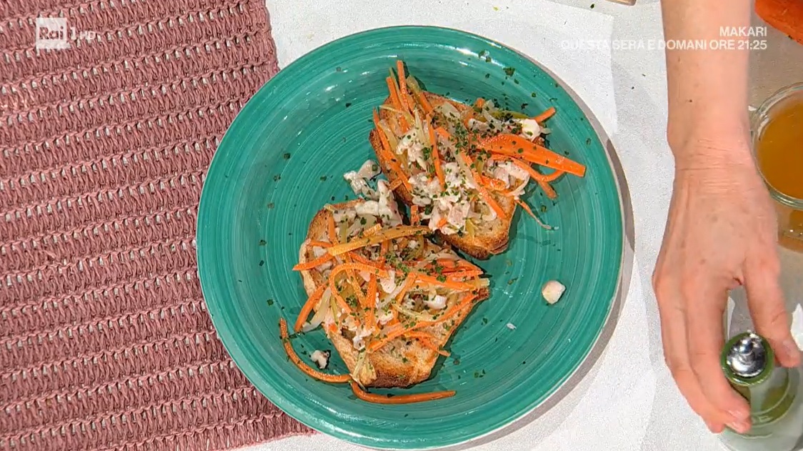 Per le bruschette, mettiamo un po’ del pesce spadellato in una ciotola. Portiamo a bollore dell’acqua con l’aceto bianco; quando bolle, spegniamo ed immergiamo le verdurine a listarelle (carote e sedano). Lasciamo per 2 minuti. Scoliamo ed uniamo al ragù di pesce. Serviamo su dei crostoni di pane abbrustoliti.
