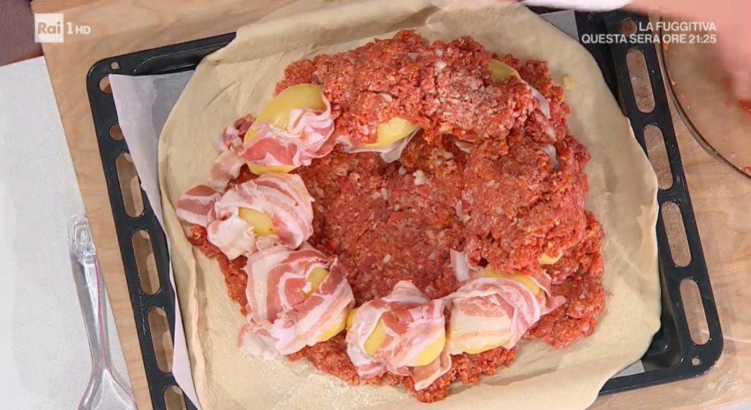 Stendiamo l’impasto lievitato sul piano infarinato (ne teniamo da parte circa 500 g), con il mattarello, in modo da ottenere un disco sottile. Lo trasferiamo sulla placca da forno con la carta forno. Distribuiamo sopra metà dell’impasto di carne trita, lasciando i bordi liberi. Avvolgiamo le patate lesse e pelate con la pancetta arrotolata (2 fette per patata) e le disponiamo sulla carne trita, in modo da formare il bordo. Copriamo le patate con la carne macinata rimasta. Tagliamo i lembi della pasta di pane a spicchi e li ripieghiamo sulle patate, uno si ed uno no.