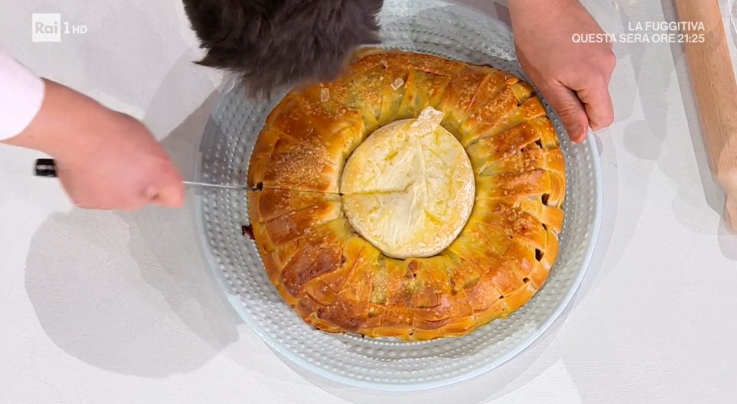 Stendiamo i 500 g di impasto rimasti e ricaviamo delle strisce. Avvolgiamo queste strisce ai lati del colosseo e le intrecciamo con i lembi della pasta, in modo da creare una sorta di cesto. Spennelliamo con l’uovo sbattuto, riempiamo il foro centrale con della carta forno e cuociamo in forno caldo e statico a 180° per 30 minuti; tiriamo fuori, inseriamo la forma di camembert al centro e cuociamo altri 10 minuti.