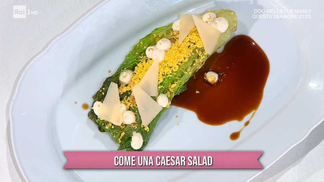 Prendiamo la lattuga appassita e grattugiato sopra i tuorli sodi. Creiamo sopra dei ciuffi di maionese. Coliamo sopra qualche goccia di salsa worcestershire, parmigiano a scaglie e finiamo con il fondo di pollo, che mettiamo sul fondo del piatto.