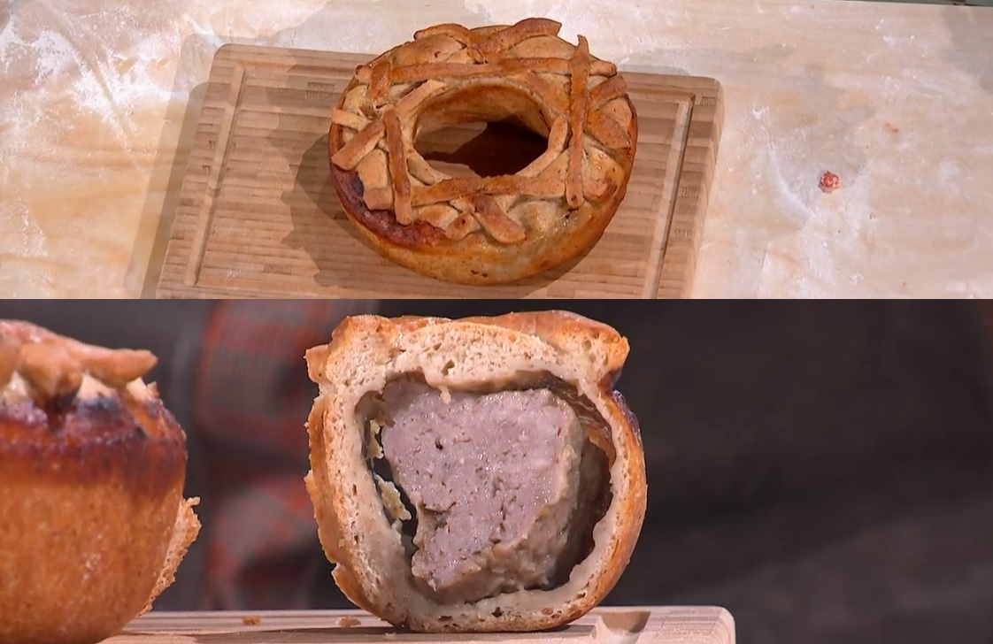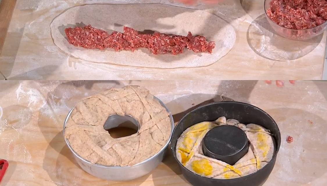 Stendiamo un panetto con il matterello, in modo da ottenere un rettangolo spesso circa mezzo cm. Distribuiamo sopra la pasta di salsiccia, creando una striscia di ripieno su un lato (foto). Ripieghiamo la pasta sul ripieno, eliminando eventualmente l’eccesso, e sigilliamo bene la congiuntura, pizzicandola. Inseriamo la ciambella in uno stampo da ciambella ben unto da 25 cm di diametro. Decoriamo con i ritagli di pasta e spennelliamo con l’uovo sbattuto. Copriamo e lasciamo lievitare per 3 ore a temperatura ambiente.