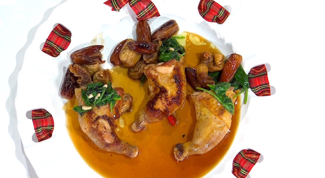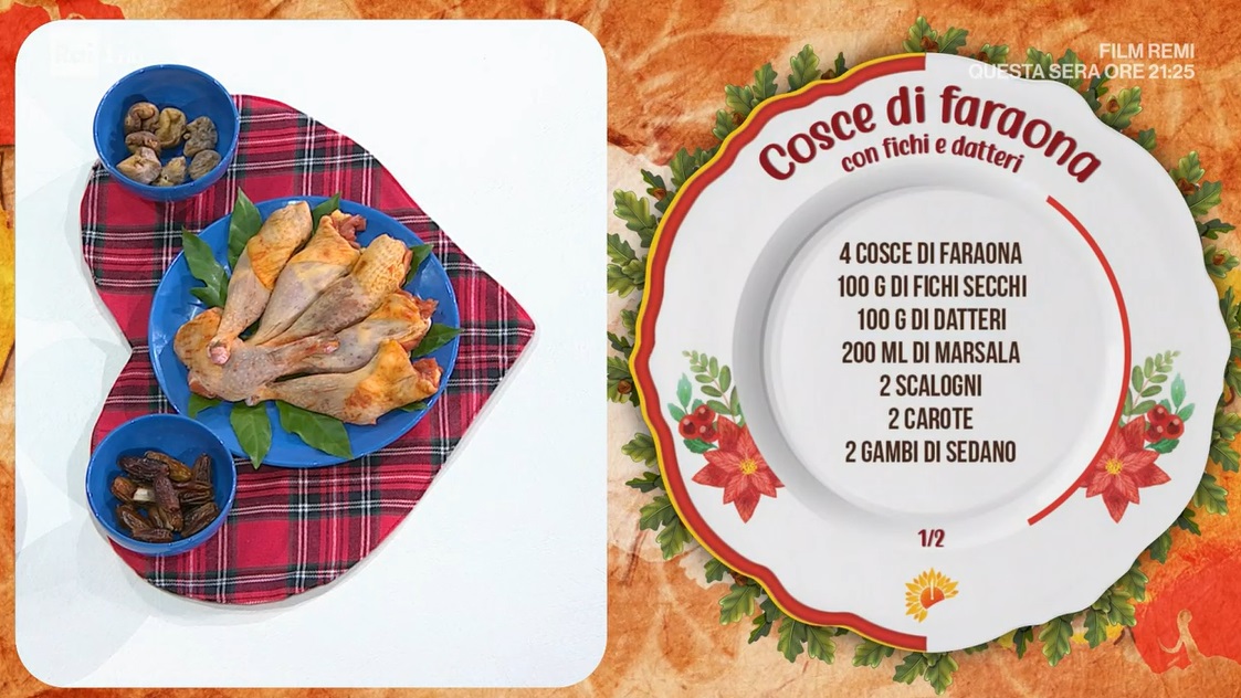 - 4 cosce di faraona, 100 g fichi secchi, 100 g datteri, 200 ml Marsala, 2 scalogni, 2 carote, 2 gambi di sedano, 100 g spinaci, 20 g pinoli, peperoncino, pepe, olio evo, burro