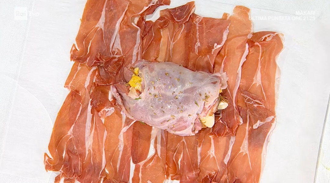 Su un foglio di carta forno, disponiamo le fette di prosciutto crudo, sovrapponendole leggermente, in modo da ottenere un rettangolo. Prendiamo la fetta di agnello marinato, ben sgocciolata, e la stendiamo sul piano. Disponiamo sopra le fette di guanciale sottili, le uova strapazzate, i carciofi saltati in padella, la provola affettata, il pecorino grattugiato, quindi arrotoliamo l’agnello sul ripieno (dal lato corto), ben stretto. Posizioniamo l’arrosto sul rettangolo di prosciutto crudo ed avvolgiamo quest’ultimo sull’arrosto. Copriamo il tutto con la carta forno e posizioniamo sulla placca da forno. Irroriamo con abbondante vino bianco.