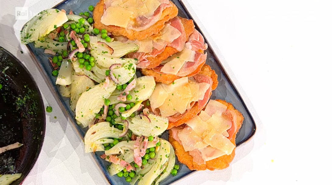 Per il contorno, facciamo soffriggere la cipolla tritata con un filo d’olio e la pancetta a dadini o listarelle. Uniamo i piselli sbollentati ed i finocchi sbollentati e tagliati a fettine. Lasciamo insaporire, quindi bagniamo con il brodo e portiamo a cottura. Sale, pepe, prezzemolo tritato e serviamo insieme alle cotolette.
