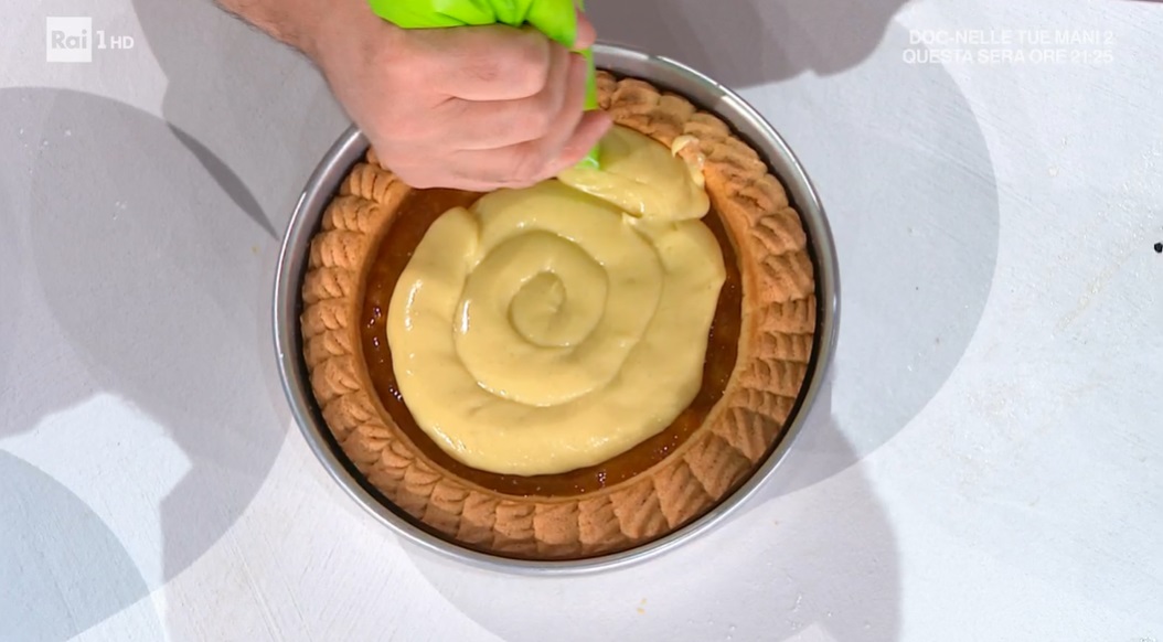 Foderiamo il fondo di una tortiera del diametro da 22 cm con un disco di frolla classica (la preparate seguendo il vostro metodo abituale). Sui bordi, invece, creiamo una corona di frolla montata (foto). Bucherelliamo il fondo con una forchetta ed inseriamo al centro uno stampo del diametro inferiore, che tocchi i bordi di frolla montata. Cuociamo in forno caldo a 180° per 25 minuti; togliamo lo stampo all’interno e proseguiamo la cottura ancora 10 minuti.