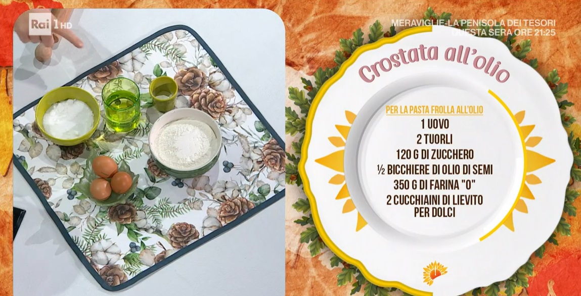 Prepariamo la frolla all’olio. In una ciotola disponiamo la farina a fontana con il lievito per dolci e lo zucchero, quindi inseriamo al centro l’uovo ed il tuorlo e cominciamo a mescolare con una spatola. Aggiungiamo l’olio di semi e lavoriamo fino ad ottenere un panetto omogeneo e compatto; non serve farlo riposare. Dividiamo la frolla in due parti (uno leggermente più piccola dell’altra) e le stendiamo, in modo da ottenere due dischi del diametro della tortiera scelta.