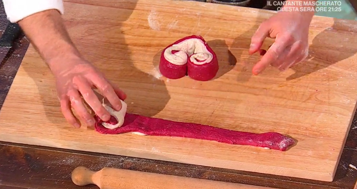 Sul banco infarinato, stendiamo con le mani i due impasti, in modo da formare due rettangoli lunghi circa 30 cm. Li stendiamo con il mattarello, in modo da ottenere uno spessore di circa 1 cm. Sovrapponiamo il rettangolo rosso su quello bianco. Rifiliamo i bordi, in modo da ottenere un rettangolo perfetto. Ritagliamo delle strisce lunghe 30 cm e larghe circa 3-5 cm. Se l’impasto è troppo molle, mettiamolo per mezz’ora in frigorifero.