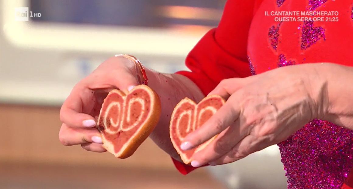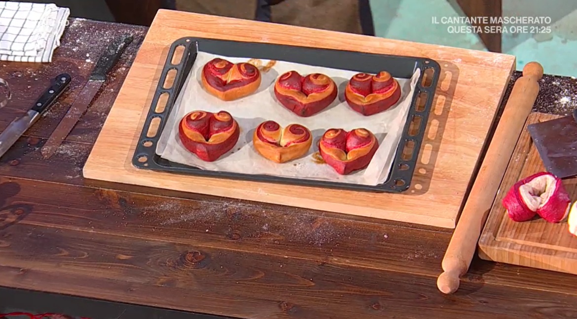 Prendiamo una striscia e la arrotoliamo su se stessa, prima da un lato, poi dall’altro, arrivando al centro. Allunghiamo leggermente il ventaglio ottenuto, in modo da dare la forma di un cuore. Disponiamo i panini su una teglia, copriamo e lasciamo lievitare ancora 1 ora e mezza al caldo. Cuociamo in forno caldo e statico a 240° per 20 minuti.