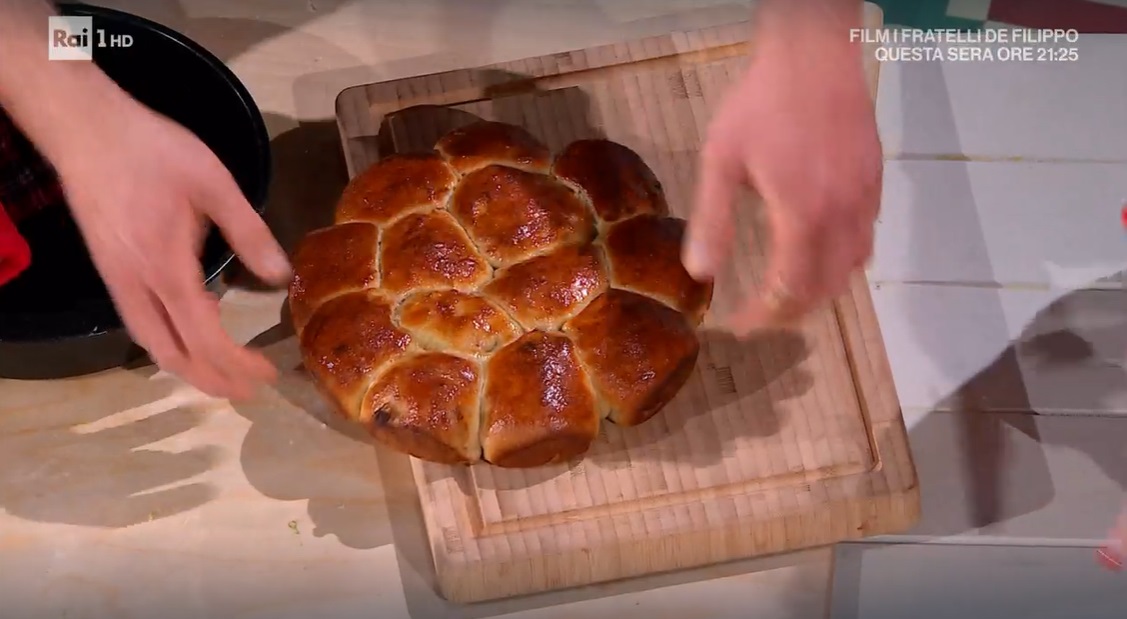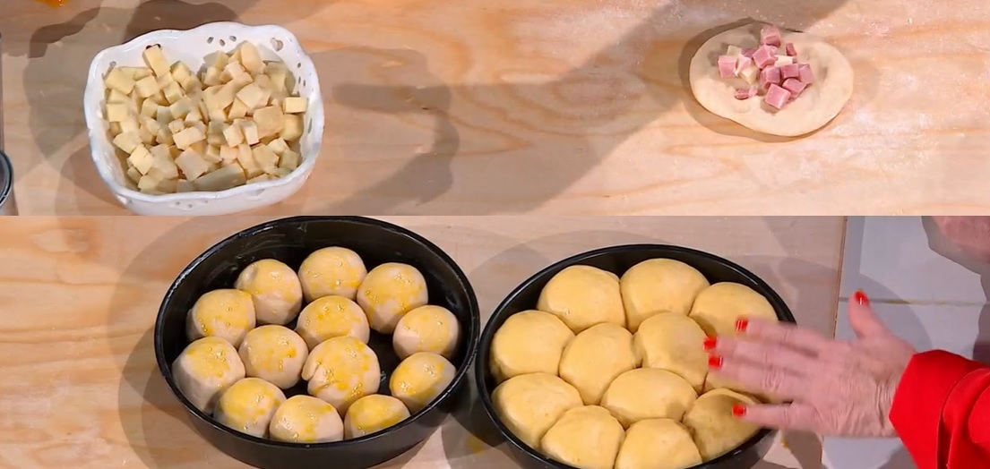 Allarghiamo ogni pallina sul piano, con le mani, e inseriamo al centro 1/3 di formaggio e 2/3 di salume a dadini. Richiudiamo l’impasto sul ripieno e lisciamo nuovamente la pallina. Disponiamo quest’ultime all’interno di una teglia imburrata (Fulvio usa una tortiera del diametro di 25 cm), distanziandole di circa 1 cm. Spennelliamo con l’uovo sbattuto, copriamo e lasciamo lievitare ancora 1 ora e mezza a temperatura ambiente.