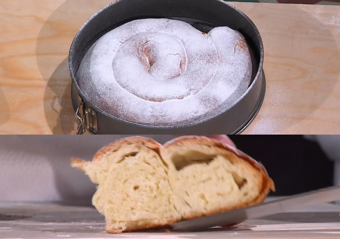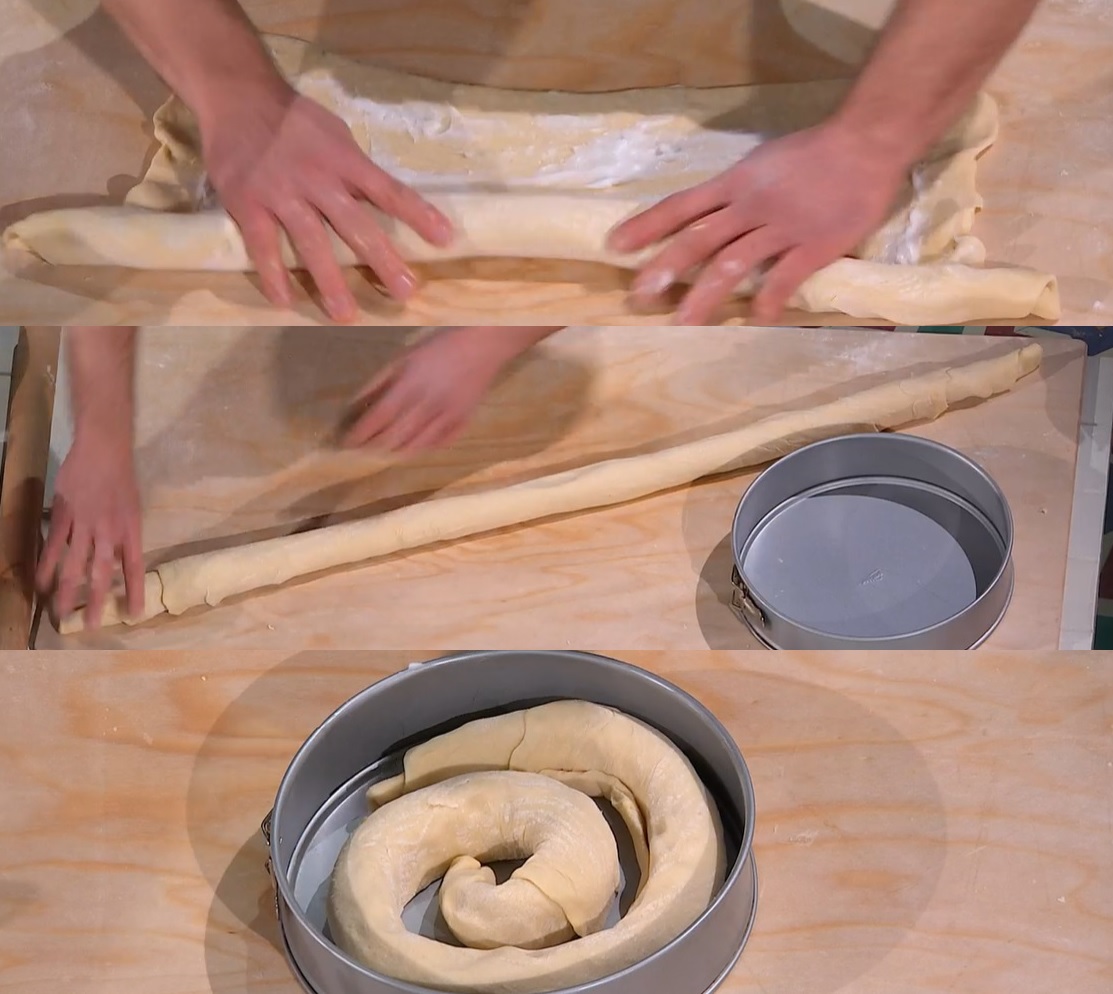Prendiamo un rettangolo lievitato e lo stendiamo ancora con il mattarello, ad uno spessore inferiore al mezzo cm. Spalmiamo sopra lo strutto, con le mani. Arrotoliamo il rettangolo su se stesso, partendo dal lato lungo, fino a formare un salsicciotto ben stretto. Allunghiamo il salsicciotto con le mani, tirandolo alle estremità. Arrotoliamo il salsicciotto su se stesso, a formare una chiocciola che inseriamo dentro una tortiera. Allarghiamo la chiocciola all’interno della teglia, copriamo e lasciamo lievitare fino al raddoppio del volume.