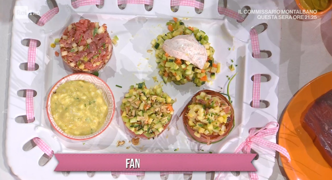 fantasia di tartarePer la gioia di Alfio, scende dalle sue montagne, per tornare nelle cucine di Rai1 la brava ed avvenente Barbara De Nigris. La cuoca altoatesina prepara uno dei piatti che raccontano la sua estate ad alta quota. Ecco una fantasia di tartare.