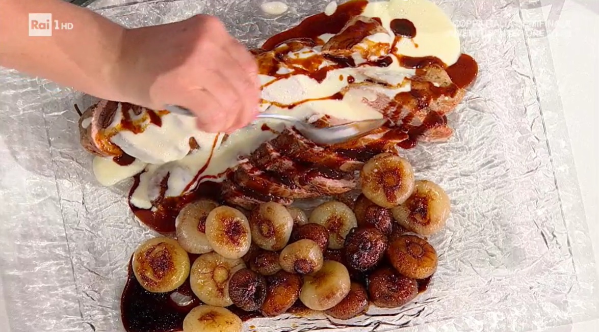 Serviamo il maiale a fette spesse, colando sopra la crema di pecorino e qualche goccia di caramello salato. Affianchiamo le cipolline in agrodolce.