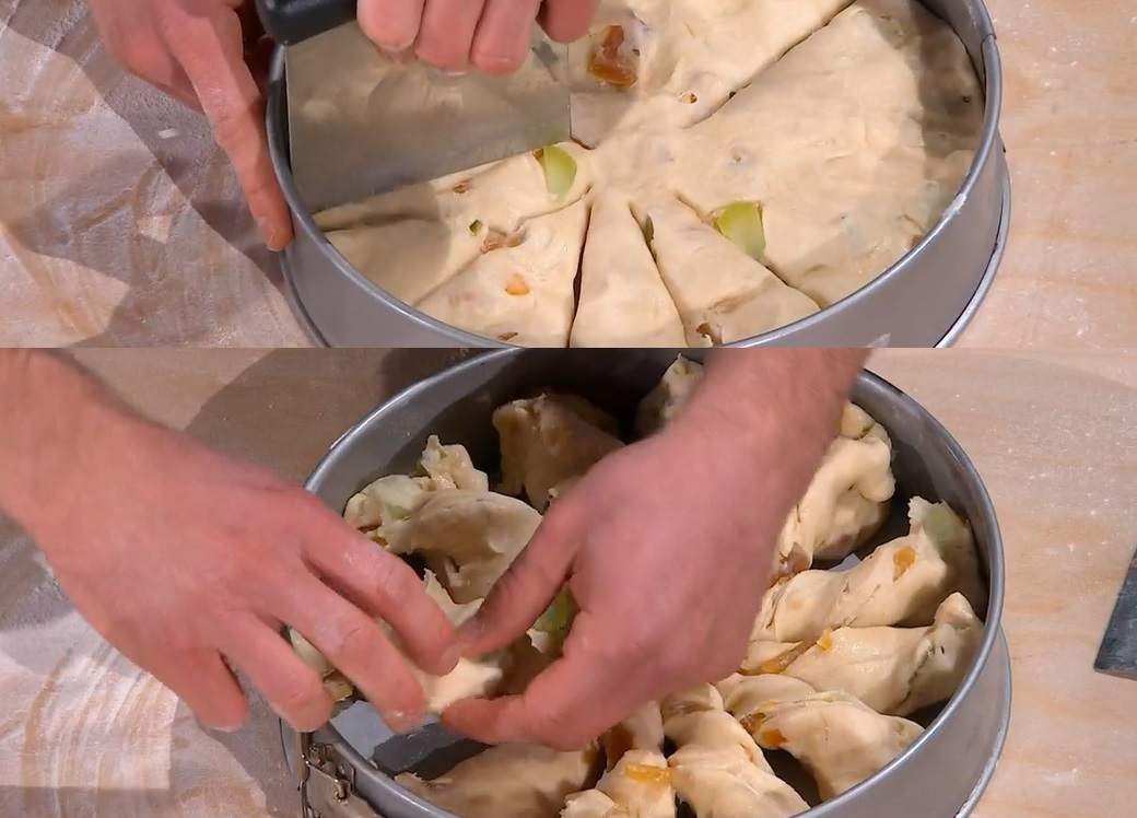 Imburriamo una tortiera del diametro di 32 cm. Schiacciamo all’interno l’impasto, che sarà duro ed avrà lievitato poco. Con un coltello o un tarocco, dividiamo il tondo dapprima in 4 parti, incidendo una croce in centro, poi in 12 spicchi (3 da ogni quarto). Arrotoliamo ogni spicchio su se stesso, formando delle eliche. Copriamo e lasciamo lievitare fino al raddoppio. Spolveriamo con la granella di zucchero e cuociamo in forno caldo e statico a 180° per 40 minuti.