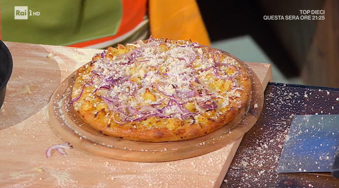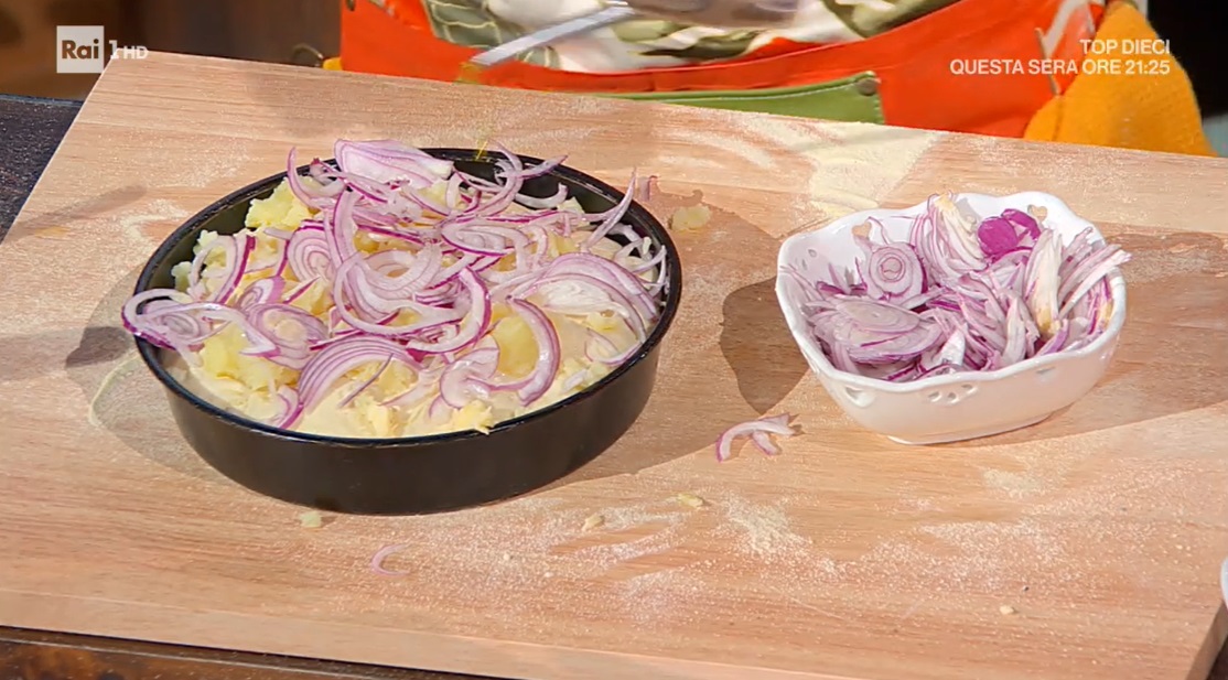 Inseriamo ogni panetto all’interno di una tortiera del diametro di circa 22 cm unta con abbondante olio evo. La allarghiamo con le mani, creando delle fossette con le dita. Copriamo e lasciamo lievitare ancora mezz’ora. Sbricioliamo sulla focaccia lievitata le patate lesse e disponiamo sopra le cipolle affettate sottili. Condiamo con l’olio e mettiamo in forno caldo e statico per 25 minuti a 240°. All’uscita dal forno, completiamo con il formaggio grattugiato.