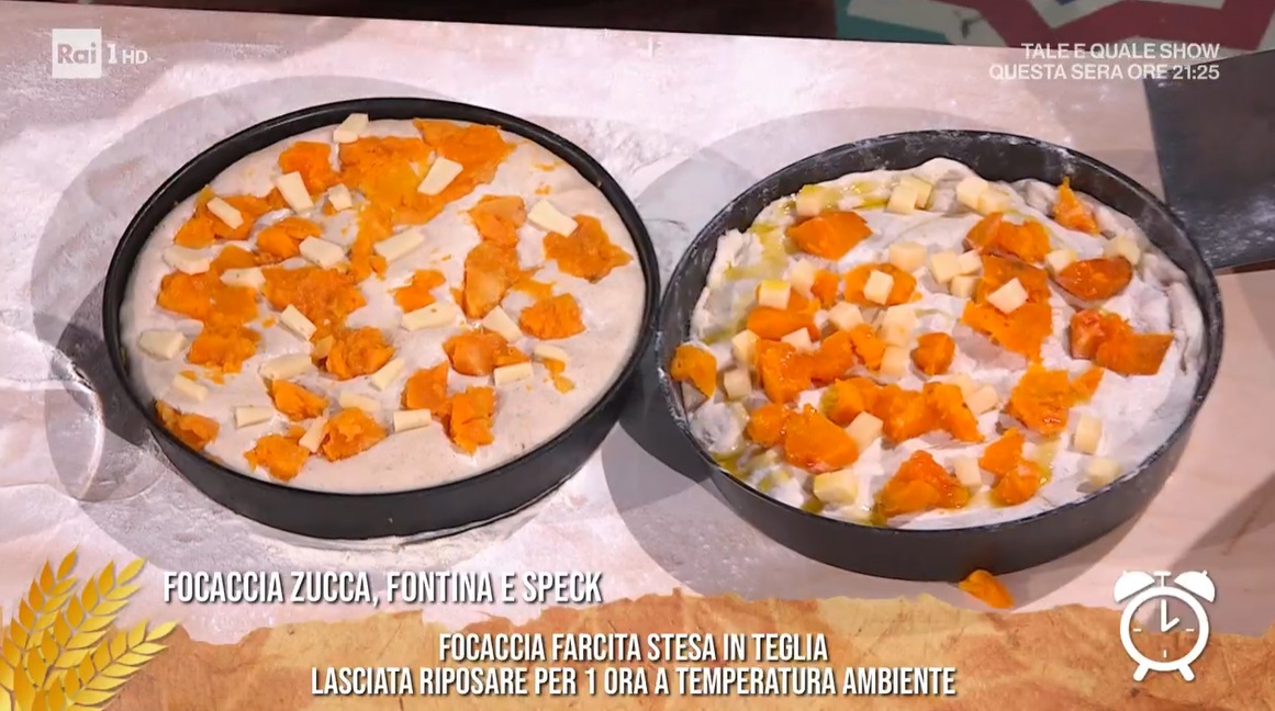 focaccia zucca fontina e speckPuntata breve, alleggerita di molte rubriche, ma non della rubrica più amata dal pubblico, quella dedicata ai lievitati e firmata da Fulvio Marino. Il giovane panettiere piemontese, come ogni venerdì, propone la ricetta di una pizza o una focaccia. Oggi, nel dettaglio, prepara la focaccia zucca fontina e speck.