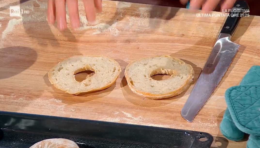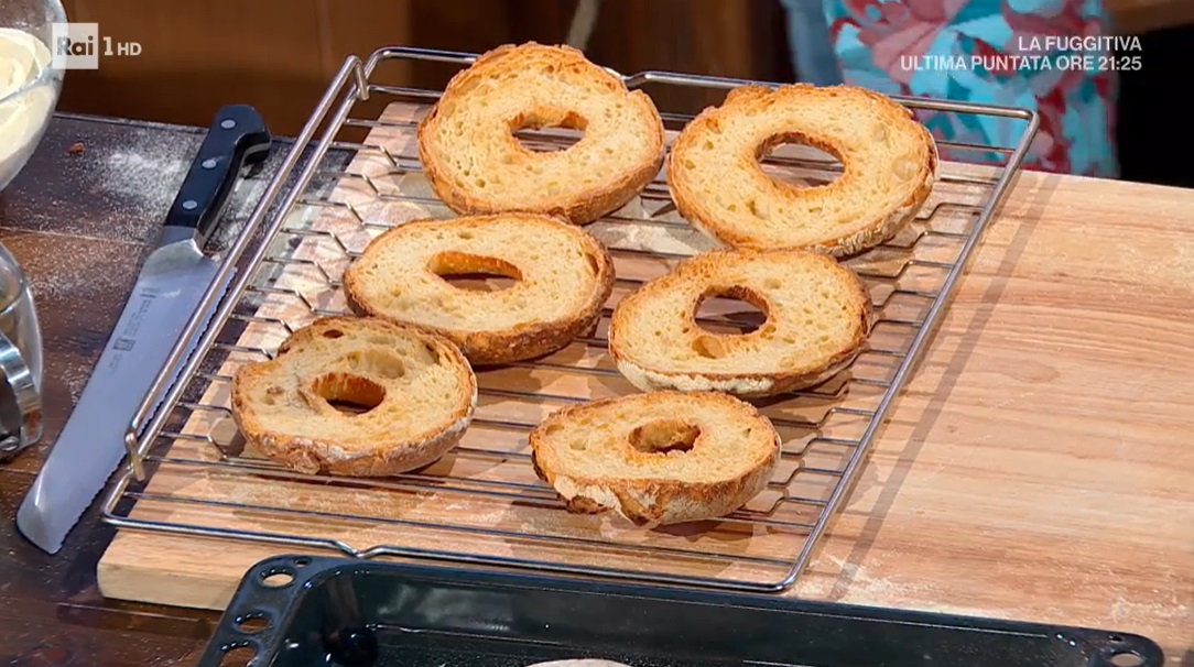 Appena sfornate, tagliamo le ciambelle di pane a metà e le disponiamo nuovamente sulla griglia. Lasciamo raffreddare, quindi rimettiamo in forno caldo a 120° per 50 minuti. Prima di consumarle, le immergiamo per pochi secondi in acqua.