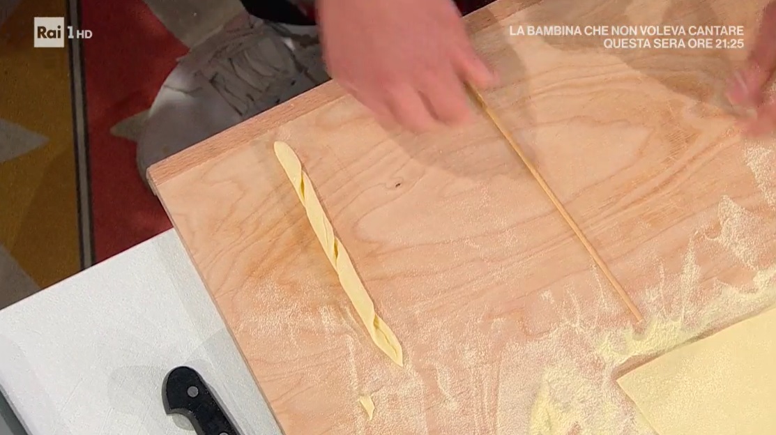 Tiriamo la sfoglia ad uno spessore di 4-5 mm. Tagliamo dei rettangolini lunghi circa 5 cm. Arrotoliamo quest’ultimi intorno al ferretto, rotolando sul piano la pasta, in modo da assottigliarla.