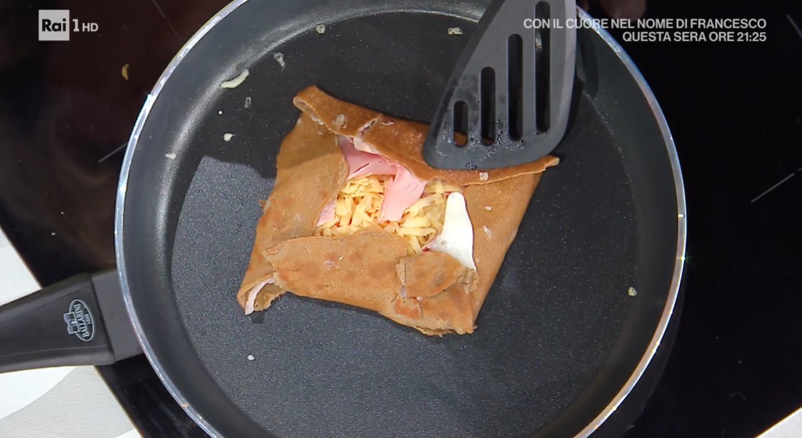 Scaldiamo per bene una padella unta d’olio. Quando è rovente, coliamo sopra la pastella e la allarghiamo, roteando la padella. Quando si formano le bollicine, la giriamo, proprio come si fa con le crepes. Appena girata la galette, apriamo sopra l’uovo intero ed aspettiamo che l’albume si rapprenda: la galette, nel frattempo, diventerà croccante. Quando l’albume si è rappreso, distribuiamo sopra il prosciutto cotto affettato e, a piacere, dei funghi trifolati. Grattugiamo sopra il groviera e ripieghiamo i bordi della galette sul ripieno, in modo da formare un quadrato. Quando la base è ben rigida e croccante, la serviamo.