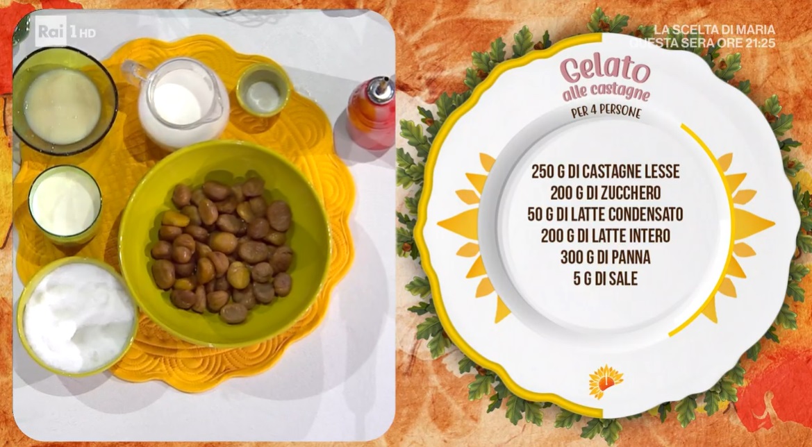 gelato alle castagneZia Cri non c’è ancora, poichè aspetta di riprendersi dall’influenza che l’ha atterrata, ma al suo posto arriva il maestro del gelato, Massimiliano Scotti, che ci prepara uno dei suoi gelati utilizzando le castagne, frutta di stagione dalle mille proprietà. Ecco il gelato alle castagne.