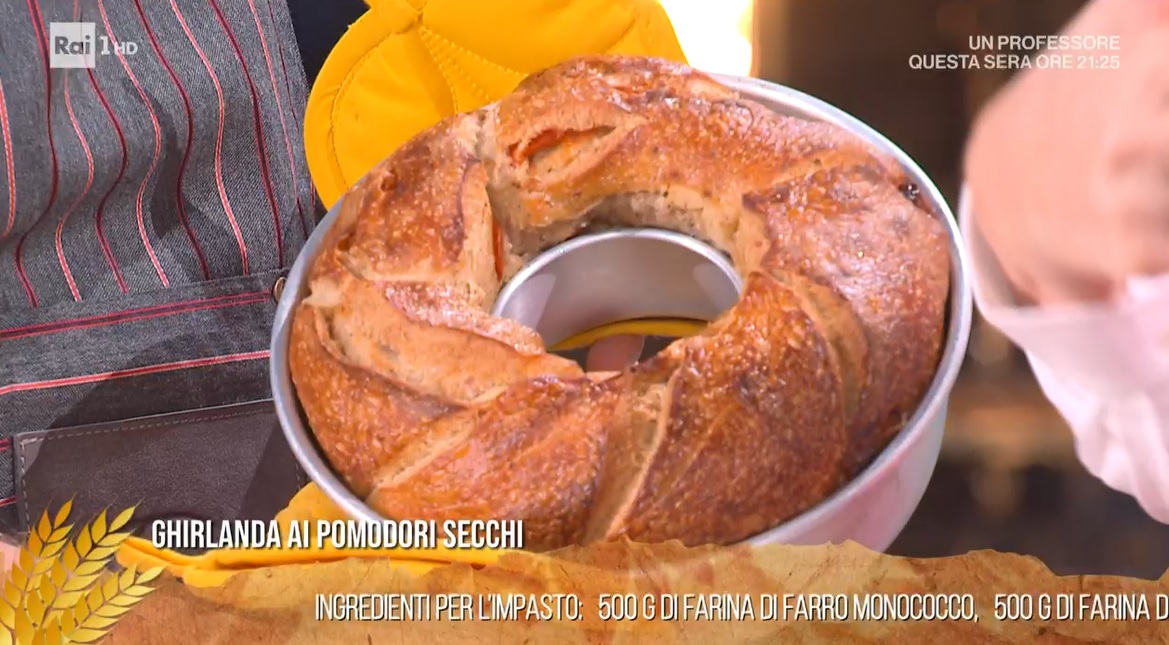 Prendiamo un panetto e lo stendiamo con il mattarello ad uno spessore di mezzo cm, in modo da ottenere un rettangolo. Posizioniamo sopra il pomodoro secco (foto). Arrotoliamo l’impasto sul pomodoro, in modo da ottenere un salsicciotto che allunghiamo. Facciamo lo stesso con un altro panetto. Intrecciamo i due salsicciotti ottenuti ed inseriamo la treccia all’interno di uno stampo a ciambella oliato da almeno 22 cm. Copriamo e lasciamo lievitare finchè l’impasto inizia ad uscire dallo stampo. Spennelliamo con l’olio e facciamo cuocere in forno caldo e statico a 230° per 40 minuti.