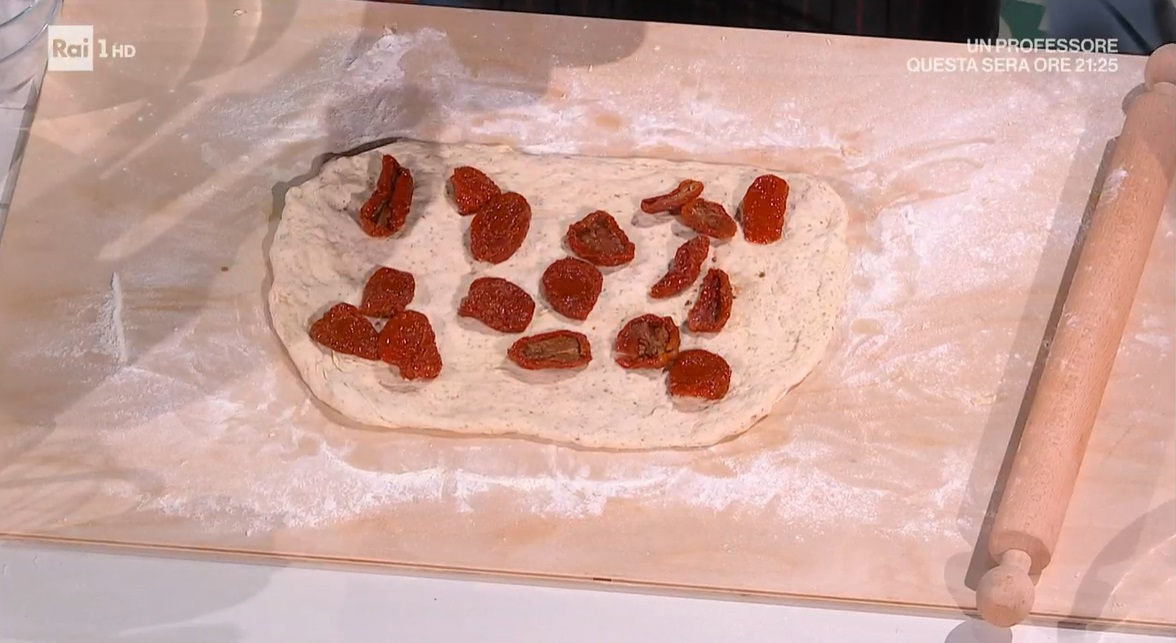 In una ciotola, o in planetaria, mettiamo le due farine, di farro e tipo 2, il lievito madre, o quello di birra fresco sbriciolato (7 g), e gran parte dell’acqua. Mescoliamo con un cucchiaio e, ad impasto formato, inseriamo il sale e l’acqua rimasta. Impastiamo qualche minuto e, infine, aggiungiamo l’olio evo a filo. Lavoriamo fino a far assorbire l’olio all’impasto, quindi aggiungiamo i pomodori secchi a pezzettini piccoli, il trito fine di erbe aromatiche e lavoriamo fino a distribuire uniformemente gli ingredienti. Copriamo e lasciamo lievitare 12 ore in frigorifero.